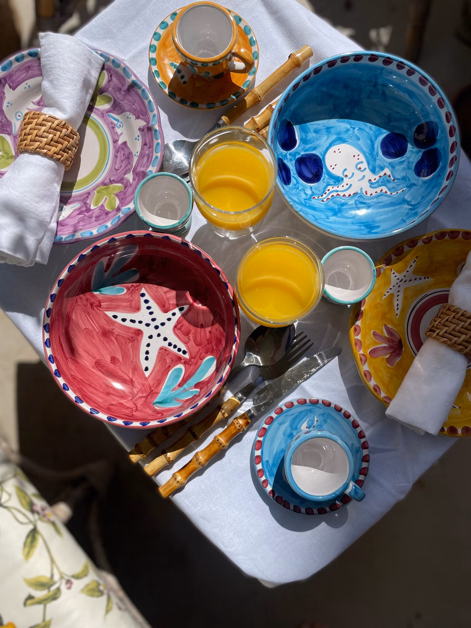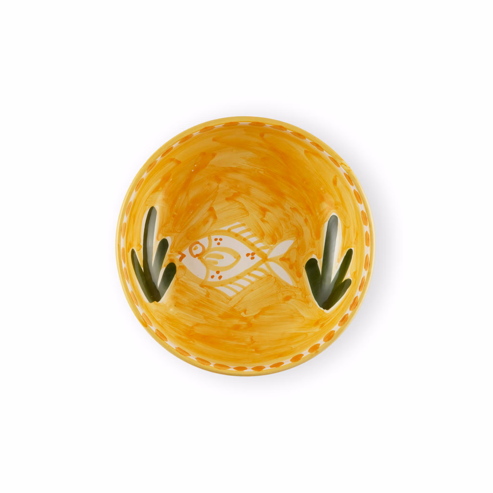 Djup skål 18 cm, eller serveringsskål med gul botten och fiskmönster. Exklusivt handmålad och handtillverkad på Amalfikusten i Italien. Perfekt för den bowls, frukost eller soppa samt som uppläggsningsskål.