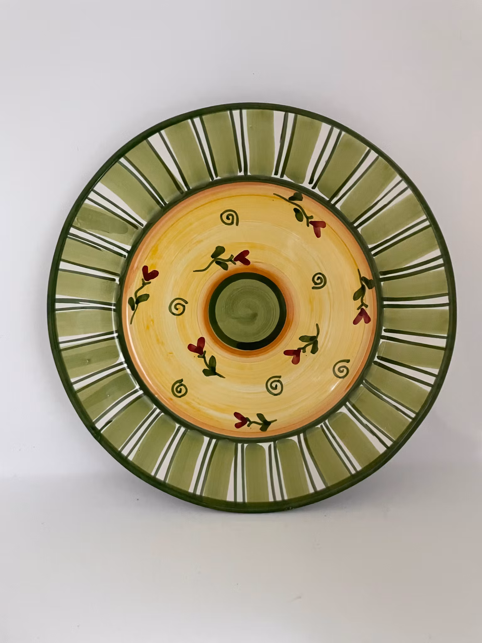 Handmålad mattallrik med gul botten med grön kant, tillverkad på Amalfikusten i Italien.